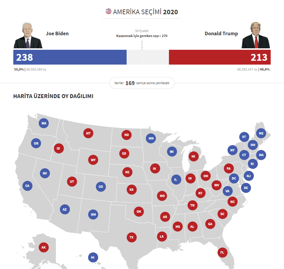 270 delegeye ulaşan bir lider olmaması durumunda ise seçim için ikinci tur yolu görünür. Şuan itibari ile Biden önde olsa da oyların az bir kısmı sayılmadı ve yakın bir zaman dilimi içerisinde bununla alakalı olarak kesin bilgileri sizlere sunacağız. Sonuç ile alakalı olarak da sitemiz içerisinde sizlere net bilgiler sunma yoluna gideceğiz.
